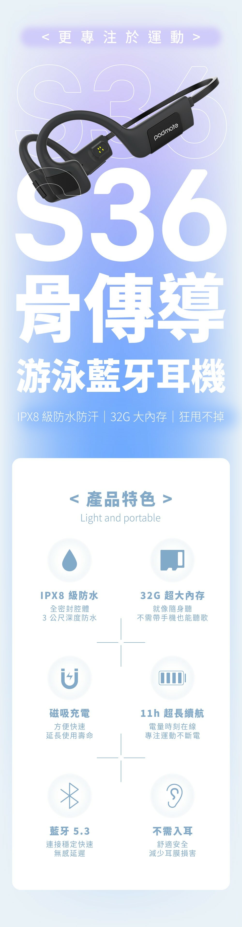 ●型號:S36 骨傳導游泳藍牙耳機