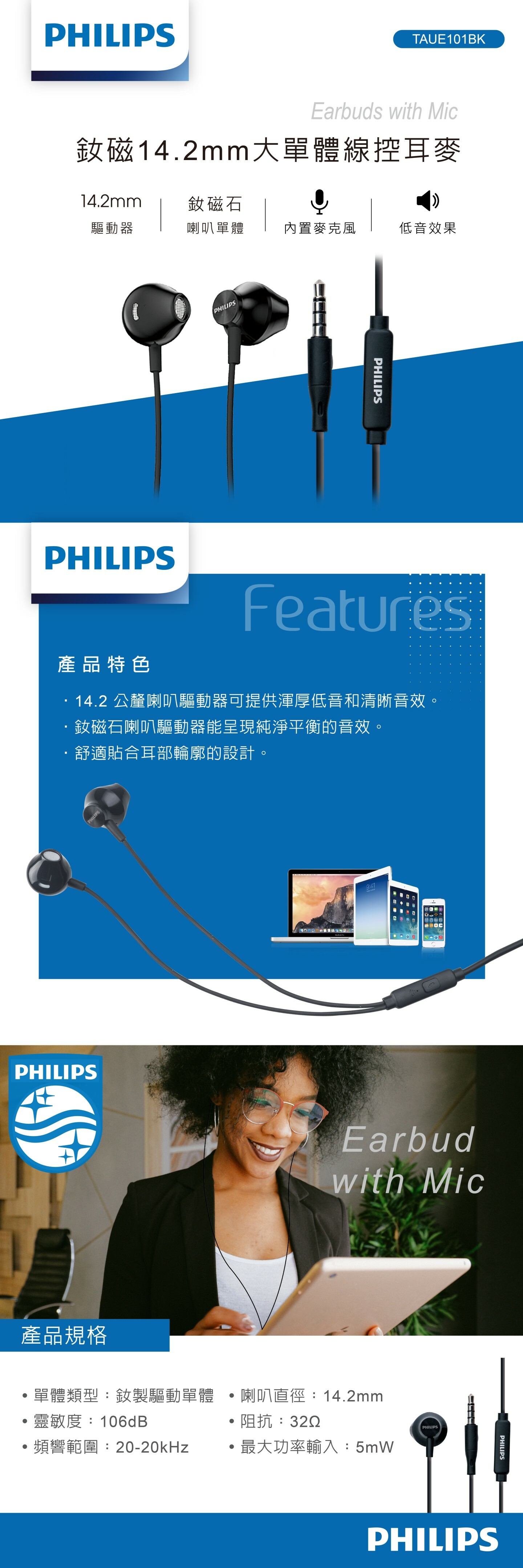 【PHILIPS飛利浦】TAUE101BK 耳機附麥克風 黑色