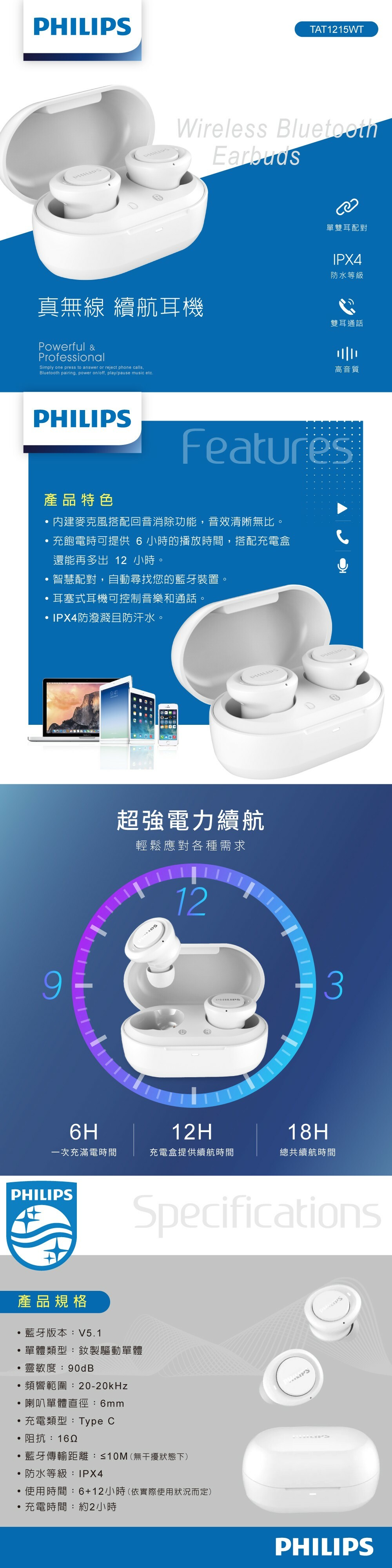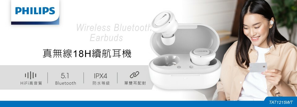 【PHILIPS飛利浦】 TAT1215WT 真無線18H續航耳機 白色