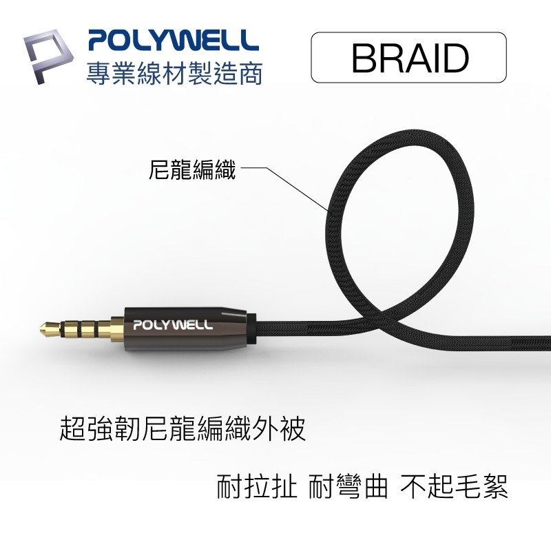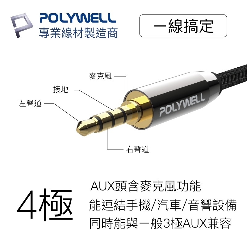 【POLYWELL】3.5mm 立體聲麥克風音源線 50公分~5米 公對公 4極 AUX 音頻線
