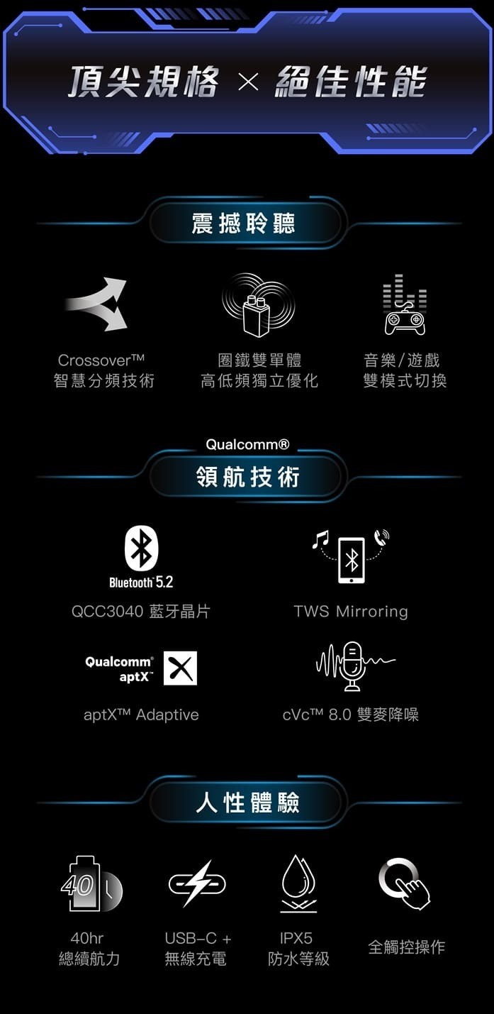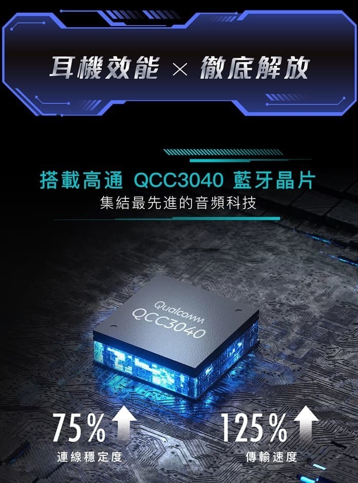 • 採用高通 QCC3040 晶片,整合最先進藍牙技術,連線更加快速