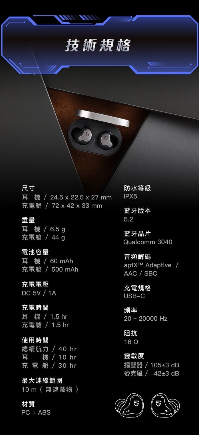 • 尺寸:耳機 24.5 x 22.5 x 27 mm,充電艙 72 x 42 x 33 mm