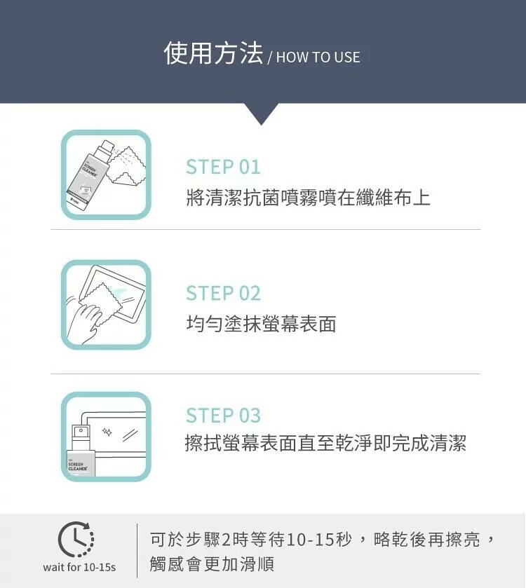 ●無論是手機、Macbook電腦液晶螢幕皆適用,可徹底清潔指紋油汙,添加聚合矽性配方,螢幕乾淨不乾澀。通過SGS檢測,清潔抗菌一次完成!