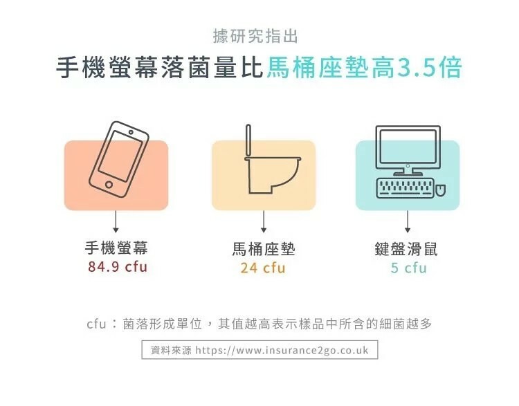 ●根據研究指出,手機上的細菌量比馬桶高出3.5倍!