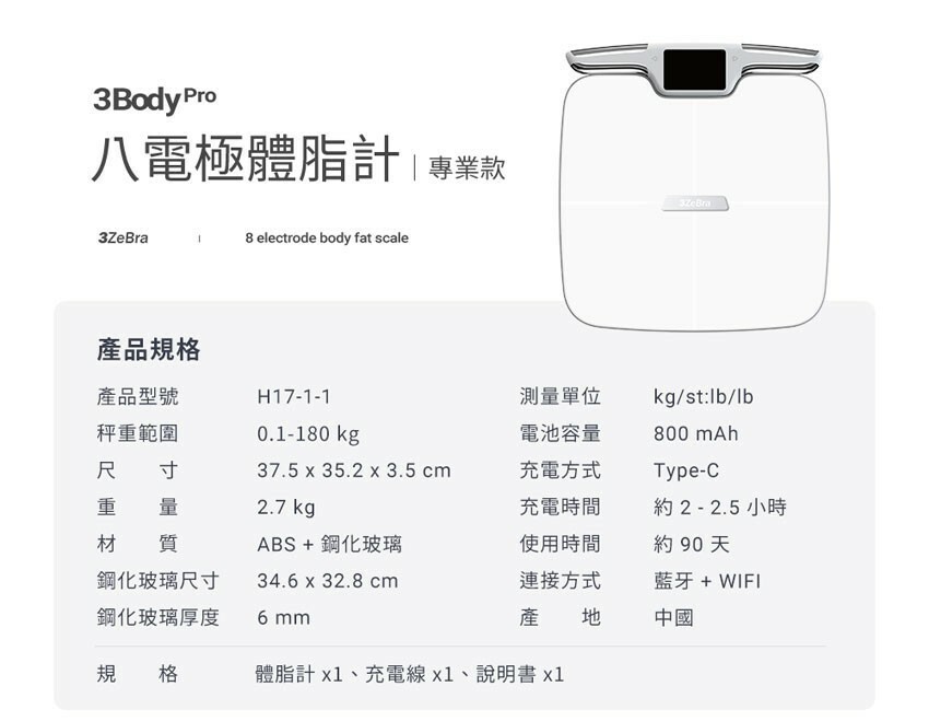 【3ZeBra 三隻斑馬】3Body Pro 八電極體脂計|專業款